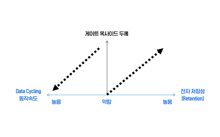 ▲ 게이트 옥사이드 두께 대비 전자의 저장성과 동작속도 @ 비휘발성 메모리