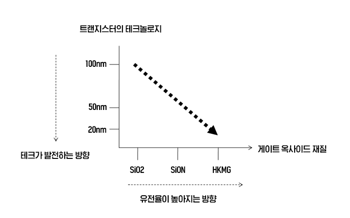 ▲ 테크놀로지에 따른 게이트 옥사이드의 재질 변화 : SiO2 > SiON > HKMG