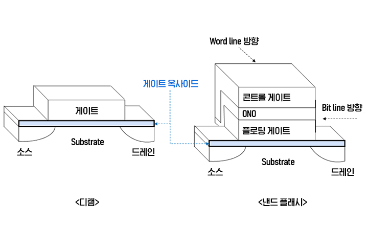 ▲ 디램과 낸드 플래시에서의 게이트 옥사이드 위치 @ 출처 : NAND Flash 메모리