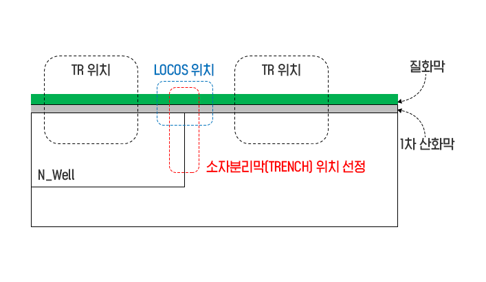 ▲ 준비단계 : 실리콘 기판 준비→절연막 형성→TR위치 선정→소자분리막(Trench) 위치 선정 @ CMOS의 수직단면