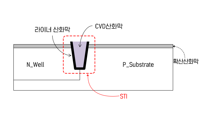 STI는 산화막을 이중으로 형성합니다. 먼저 공간이 확보된 참호 속에 본격적으로 절연물질을 채워 넣기 전에, 확산방식으로 라이너(Liner) 산화막을 얇게 입힙니다. 다음에 실시할 CVD라는 증착방식을 이용한 산화막이 실리콘 기판에 잘 형성되기 위함입니다. 혹은 고밀도 플라즈마CVD(HDPCVD)로 참호(Trench 혹은 Gap)를 채울 시, 높은 에너지를 함유한 플라즈마로부터 손상을 막아내기 위해서죠. 일반적으로 라이너 산화막은 확산시킬 노(Furnace)에 산소가스를 집어넣고 높은 온도로 가열시키면, 게이트산화막처럼 얇은 막이 형성됩니다. 산화막 대신 질화막을 사용하기도 합니다.