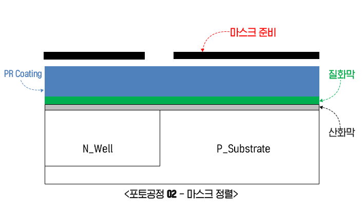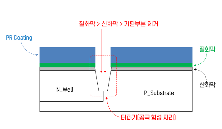▲ 참호 터파기 2단계 : 식각 - STI를 위치시킬 공간형성 (P_Substrate는 P_Well과 같은 의미임)