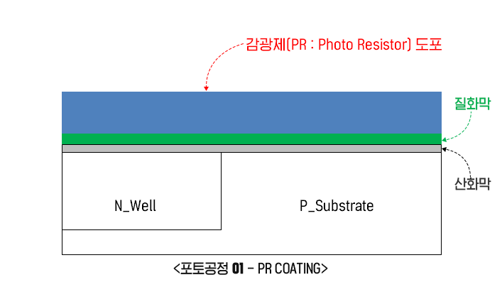 먼저 감광제(Photo Resistor)를 바르는데, 감광제는 점도가 높기 때문에 웨이퍼를 분당 1,500 ~ 3,000회 정도로 회전시키면서 절연막 위에 얇게 도포를 합니다. (감광제가 절연막 위에 쉽게 접착되지 않기 때문에 HMDS라는 접착제를 먼저 바릅니다) 도포되는 감광제는 균일한 높이가 되어야 감광 깊이가 적절해집니다. 노광 시 감광 깊이가 충분하지 않으면, 현상할 때 감광제찌꺼기가 남게 되고 연이은 식각공정에서 하부막(절연층)이 잘 제거되지 않습니다. (단자층 형성인 경우는 이온들이 충분히 주입되지 못해 소스/드레인단자가 불충분한 입체면적을 갖게 됩니다.) 감광을 시킨 후에는 웨이퍼를 다시 트랙장비로 옮겨서 감광부위를 제거시키는 현상공정을 진행합니다. 포토공정은 식각공정의 길잡이 노릇을 합니다. 즉, 웨이퍼를 테이블에 놓고 위에서 보았을 때, 포토공정에서 뚫어낸 구멍(감광부위를 현상)에 해당되는 영역만을 식각에서 없앨(하부층) 수 있습니다.