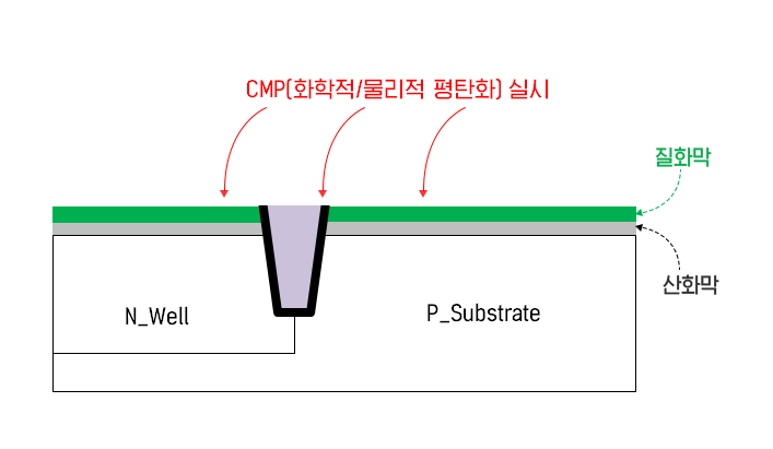 움푹 파진 참호 공간으로 인해 CVD 표면에는 단차가 생기게 됩니다. 이런 울퉁불퉁한 표면은 다음 포토 공정 시 초점을 맞추기 어렵게 한다든지, 그대로 놓아두면 다음에 형성하는 상층 막의 표면에도 굴곡이 발생한다는 문제점이 있습니다. 이를 방지하기 위해 CVD산화막 표면을 평평하게 하는 단계를 평탄화(CMP) 공정이라고 합니다. CMP는 화학적/물리적 평탄화 공정으로써, 매우 작은 알갱이 형태인 슬러리(Slurry)와 화학용액을 패드와 웨이퍼 사이에 넣어 단차를 물리적으로 갈아내어 표면을 매끄럽게 만들어 줍니다. 증착방식으로 참호를 채울 때에는 CVD 두께를 두껍게 하는데, 이는 CMP를 실시할 때 막 중에서 제일 중요한 1차산화막이 깎이거나 손상되는 것을 방지하기 위함입니다.