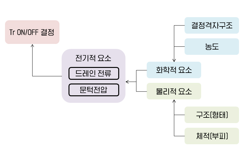 ▲ TR의 ON/OFF를 결정하는데 있어서 소스 단자와 드레인 단자가 갖추어야 할 조건 및 영향을 끼치는 변수 @도핑 시