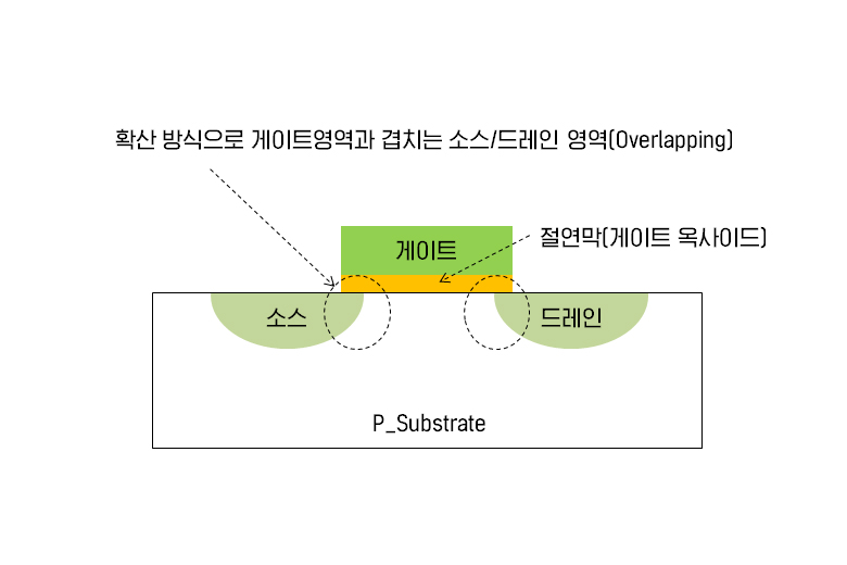 ▲ 랜덤확산운동으로 게이트와 겹치는(Overlapping) 소스/드레인 영역 발생 @이 그림은 앞의 <그림5>에서 도펀트 코팅층과 마스크층을 제거한 상태