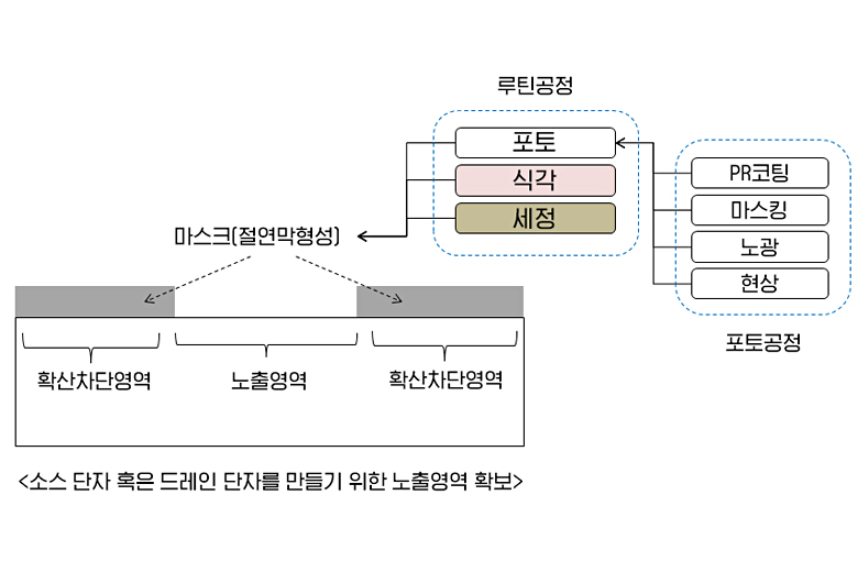 TR의 집적도가 낮을 때(소스와 드레인 사이의 거리가 충분할 때)에는 확산방식을 이용해 소스와 드레인 단자를 형성했는데요. 먼저 절연막으로 마스크 역할을 할 수 있도록 산화막 형성→포토 공정(PR코팅>마스킹>노광>현상)→식각→세정 과정을 진행해 차단영역과 노출영역을 만듭니다. 확산을 하지 않을 불필요한 영역은 마스크로 막아놓고(Blocking) 필요한 곳 일부만 open시켜 놓습니다. 이때 사용되는 마스크로는 포토 공정 시의 레티클(마스크)를 사용하는 것이 아닌, 절연막으로 마스크 기능을 대신 합니다. 마스킹 하는 막은 절연막뿐 아니라 질화막, 혹은 포토 레지스터를 사용할 수도 있습니다. 그러나 포토레지스터를 이루고 있는 폴리머라는 물질은 열에 약하기 때문에 섭씨 약 1,000도 되는 산화 공정에는 사용하지 못하고, 상온(섭씨 25도)이나 그 보다 낮은 온도의 환경(이온-임플란테이션 등)에서 사용 합니다.