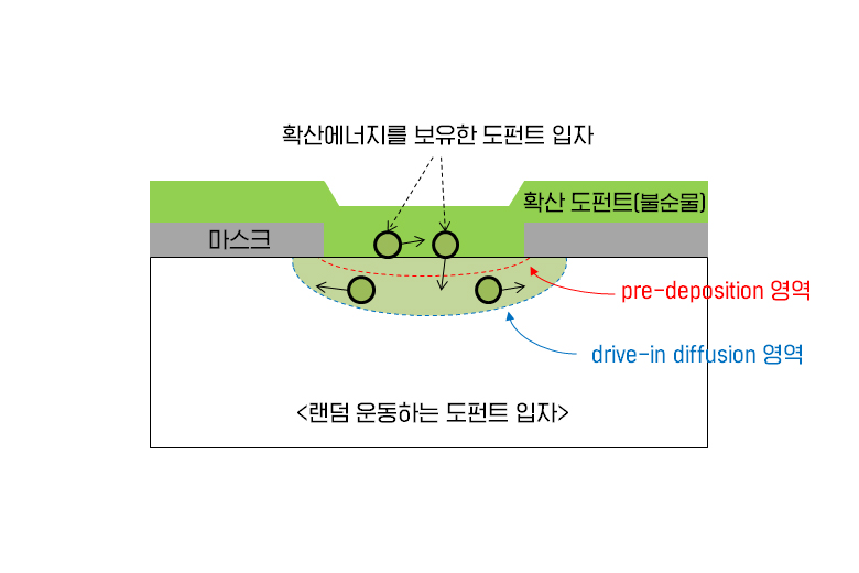 ▲ 확산로 안에서 공급되는 확산에너지로 불특정운동하는 도펀트 @소스 혹은 드레인 단자를 형성하는 과정
