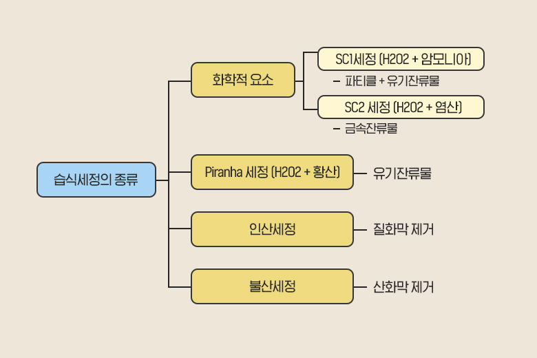 미국의 전자회사 RCA의 한 엔지니어가 1970년경 새로운 반도체 세정 방식을 개발, 이를 RCA세정이라고 칭했습니다. 이후 RCA세정 방식은 반도체 습식세정의 대명사가 되었는데요. 이는 산화반응을 하는 과산화수소를 주축으로 다른 여러 세정 물질을 섞어, 식각을 추가로 진행한다거나, 다른 세정 항목을 더하여 결과적으로 전체적인 세정 효율을 높이는 방식으로 다양화되었습니다. 과산화수소에 더하여 Mix하는 세정용 물질은 암모니아, 염산, 황산 등으로 발전하였고 그 외에 인산, 불산 등 강산성들이 반도체 세정용 물질로 사용돼 오고 있습니다.