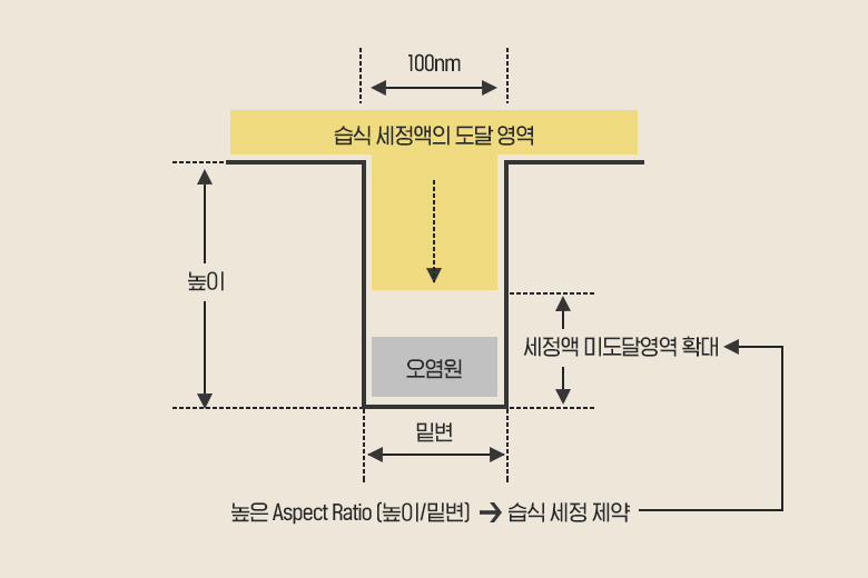 미세화 패턴에 따라 세정 방식에도 획기적인 변화가 일어납니다. 회로 선폭 100nm 이후로는 Aspect Ratio(높이/밑변) 값이 상승하여 세정용액이 트랜치(DRAM의 Capacitor나 STI라는 Tr과 Tr의 절연벽) 혹은 Via hole(메탈층을 밑에서 위로 연결하는 기둥)의 밑바닥까지 내려가지 못하는 치명적인 결함이 발생됩니다. 더 이상 고(高) Aspect Ratio에서는 습식방식이 불가하므로 다른 세정방식을 찾아야 했지요. 어떤 구조물, 혹은 외형 변화이든 식각을 한 영역은 모두 세정이 되어야 했습니다. 다행히 대안으로 등장한 건식세정은 여러 가지 방식으로 분화할 수 있어 미세화에 따라 발전에 발전을 거듭하고 있습니다.