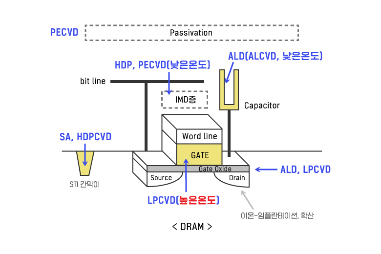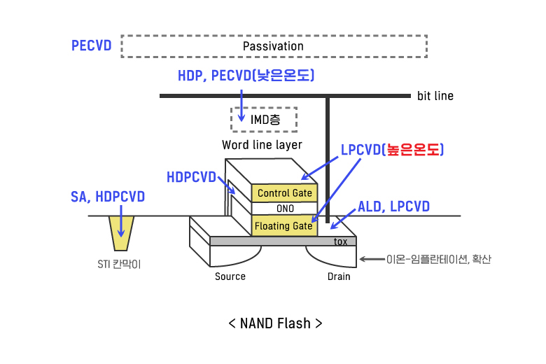 메탈층이 1~2개였던 1990년대 초반까지만 해도 집적도가 낮았기 때문에 APCVD 등을 적용할 수 있었습니다. 낮은 온도에서도 다소 거친 막질로 메탈층을 보호할 수 있었지요. 하지만 최근에는 특히 하부막으로 메탈층(알루미늄, 구리 등)이 여러 개 늘어났으며, 또 메탈과 메탈 사이 간격이 좁아져 절연막(IMD)으로 채워주어야 합니다. 이 경우 하부막인 메탈이 녹지 않도록 반드시 저온 공정인 PECVD나 HDPCVD를 적용해야 합니다. 상부에 위치한 Passivation보호막도 마찬가지입니다.